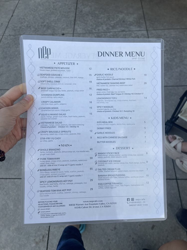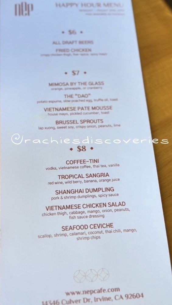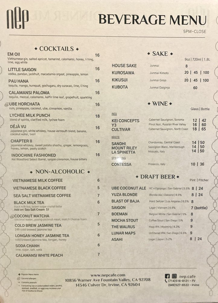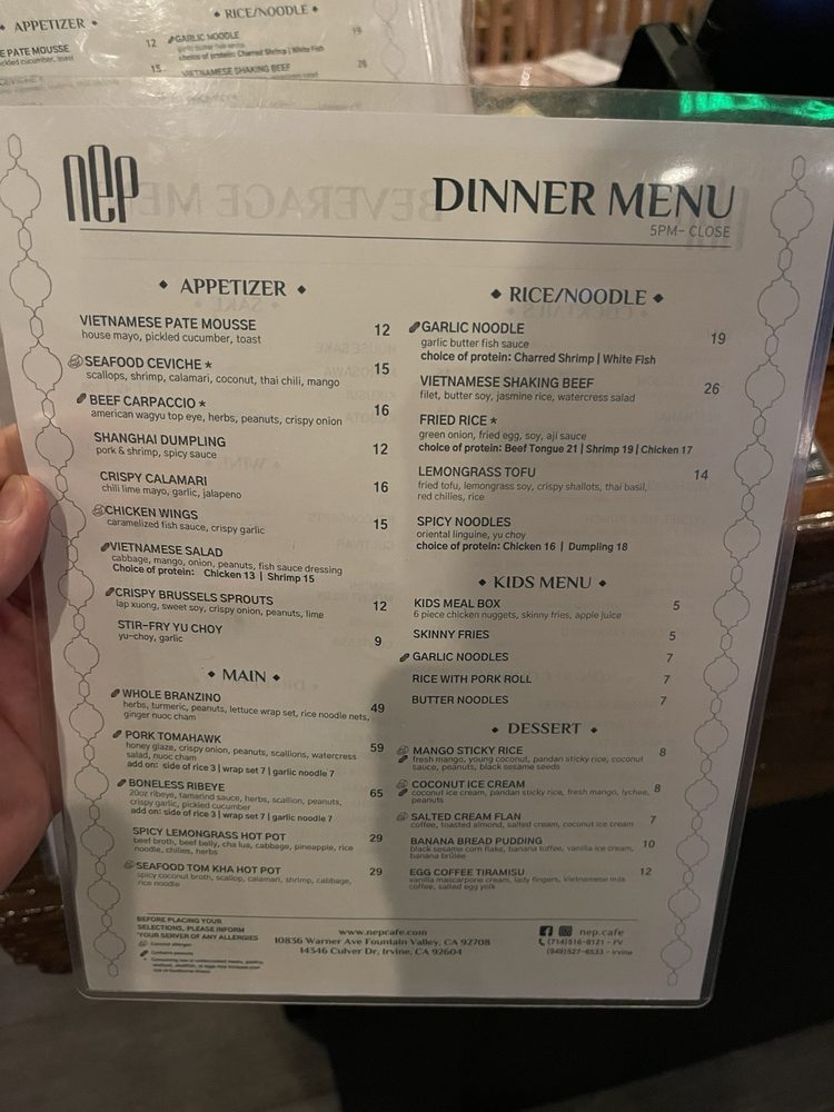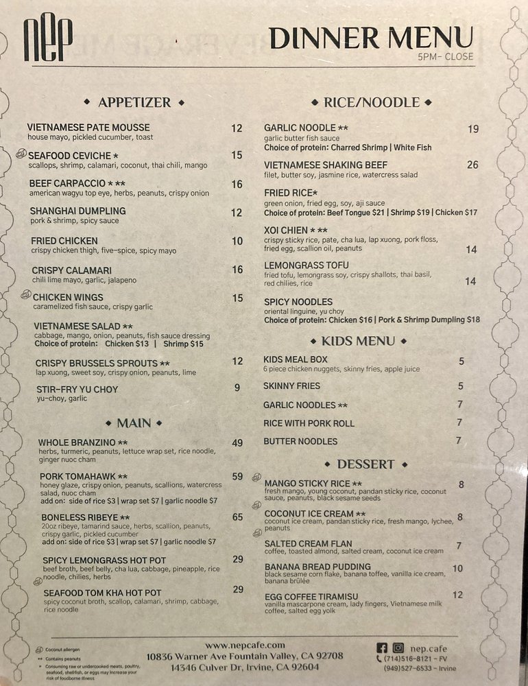 Introducing the menu at Nep Cafe by Kei Concepts, a Vietnamese cafe and cocktail bar in Irvine, CA. Known for its innovative twists on traditional Vietnamese cuisine, this Asian-owned and women-owned establishment offers a wide range of options for pescatarians, vegans, and limited vegetarians. The menu features dishes like ceviche, tofu plates, xôi mặn, banh mi chao with filet mignon, garlic noodles, crab toast, and more. Customers rave about the flavorful and unique tofu dishes, juicy filet mignon, crispy crab toast, and savory shrimp garlic noodles. With a trendy and casual ambiance, Nep Cafe also provides outdoor seating, a full bar, and happy hour specials on select nights. The restaurant is wheelchair accessible, offers private parking, and accepts cryptocurrency. Experience modern Vietnamese cuisine at Nep Cafe by Kei Concepts.