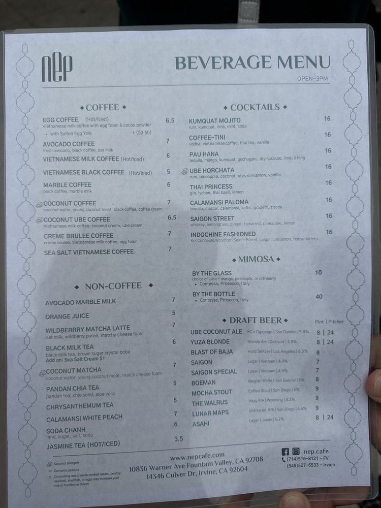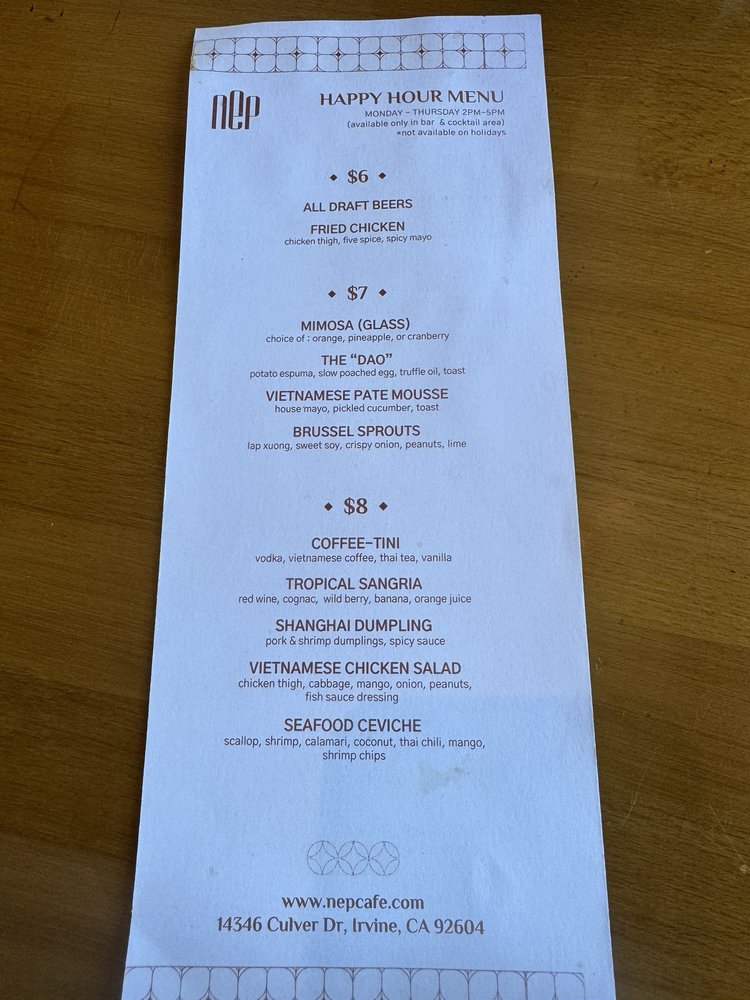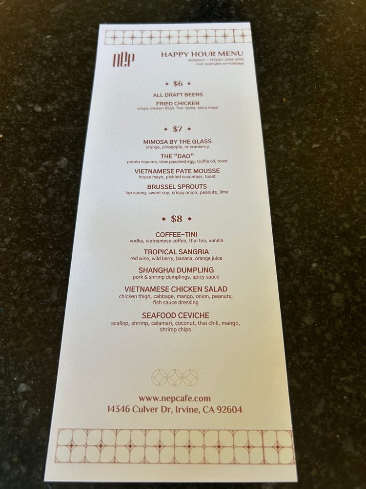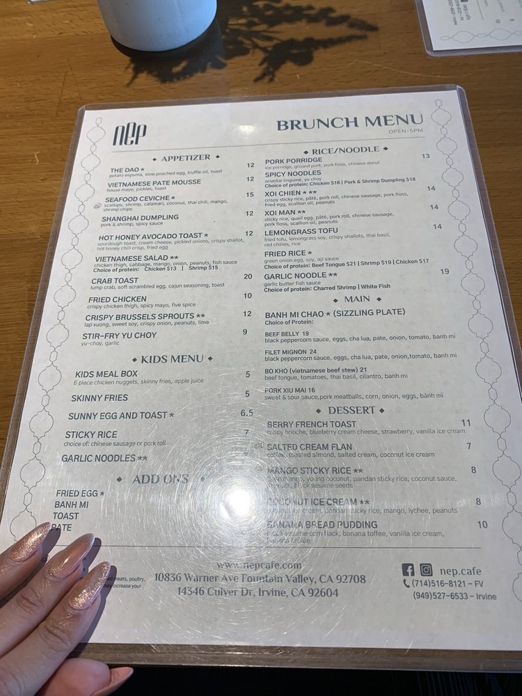 Introducing the menu at Nep Cafe by Kei Concepts, a Vietnamese cafe and cocktail bar in Irvine, CA. Known for its innovative twists on traditional Vietnamese cuisine, this Asian-owned and women-owned establishment offers a wide range of options for pescatarians, vegans, and limited vegetarians. The menu features dishes like ceviche, tofu plates, xôi mặn, banh mi chao with filet mignon, garlic noodles, crab toast, and more. Customers rave about the flavorful and unique tofu dishes, juicy filet mignon, crispy crab toast, and savory shrimp garlic noodles. With a trendy and casual ambiance, Nep Cafe also provides outdoor seating, a full bar, and happy hour specials on select nights. The restaurant is wheelchair accessible, offers private parking, and accepts cryptocurrency. Experience modern Vietnamese cuisine at Nep Cafe by Kei Concepts.